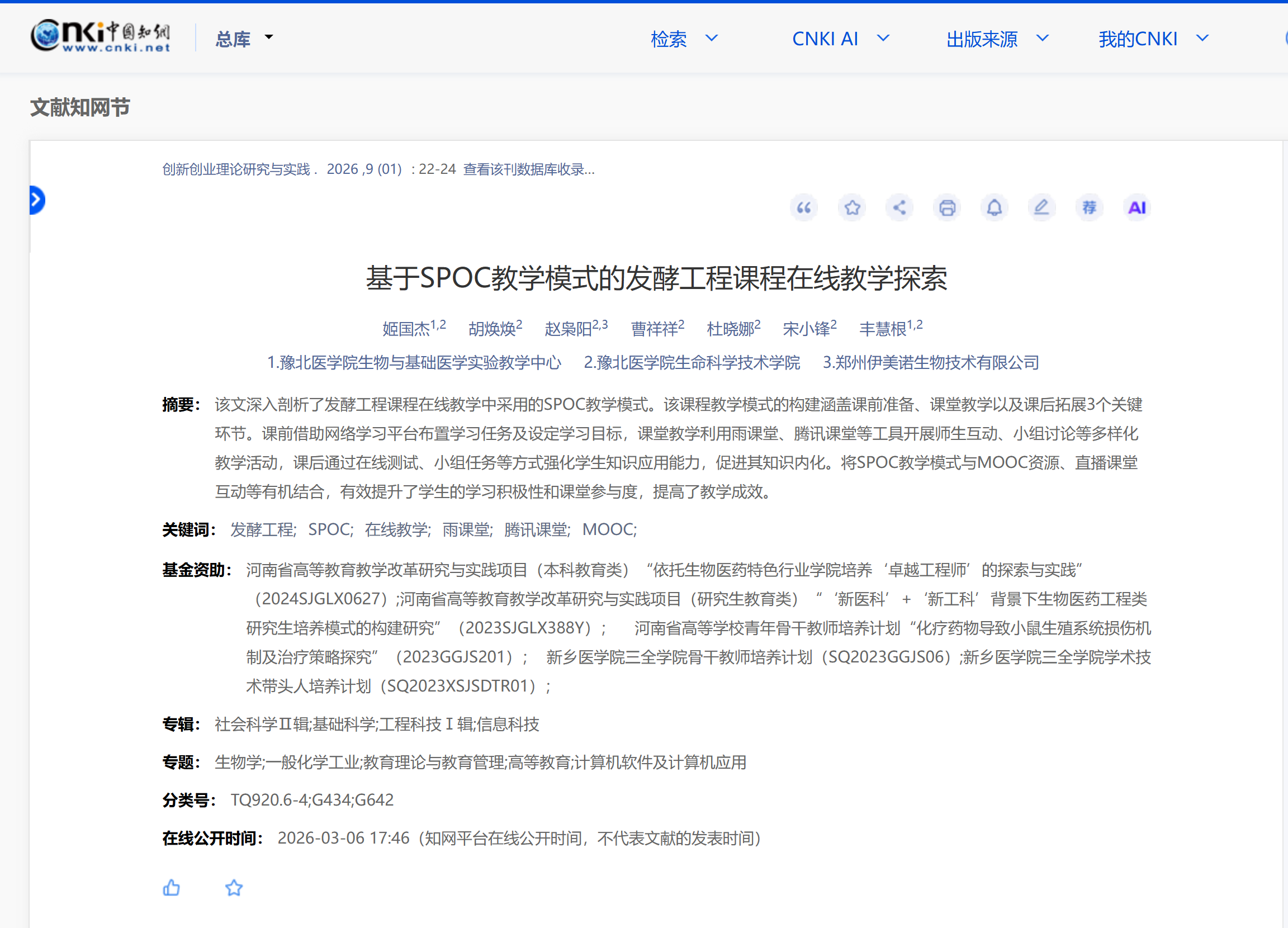 近日,生物与基础医学实验教学中心姬国杰、胡焕焕撰写的教改论文《基于 SPOC 教学模式的发酵工程课程在线教学探索》在《创新创业理论研究与实践》正式发表,该研究为发酵工程课程教学改革提供了新路径,课程还配套校企共建实训课程,实现理论与实践深度融合。
